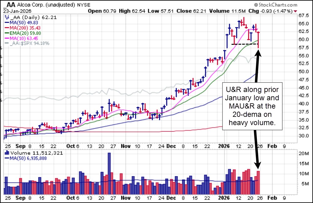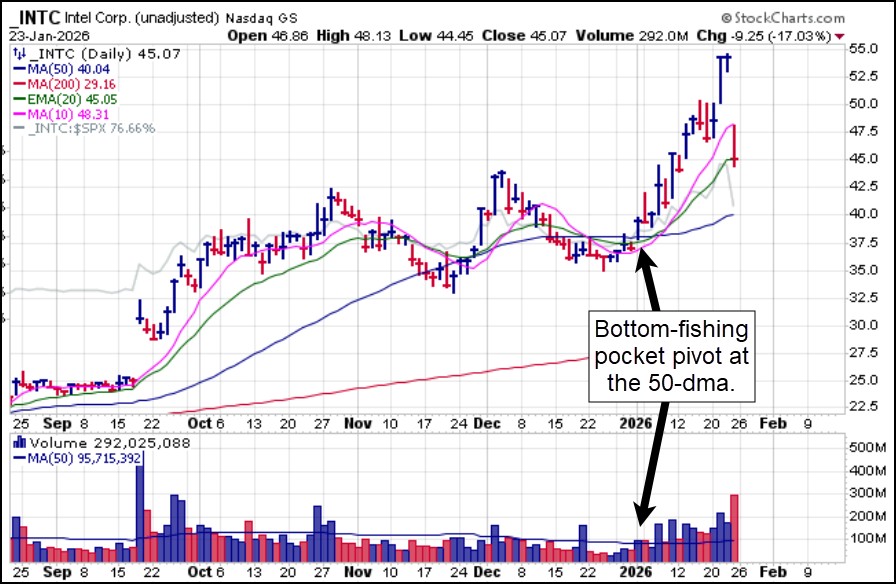 Recent semiconductor meme and FOMO name Intel (INTC), which has been running mostly on the support of the U.S. government and Nvidia (NVDA) investments in the company in late 2025, did not pass the earnings test, however, ending the sharp rally in the stock so far in 2026. We initially identified and issued a report on INTC as it posted a bottom-fishing pocket pivot (BFPP) through the 50-dma on January 2nd. The stock has had a very strong run since then but appears to have topped in the near-term as it triggered a short-sale entry at the 10-dma on Friday. We will see whether other semiconductor leaders reporting earnings this week can do better, so stay tuned.