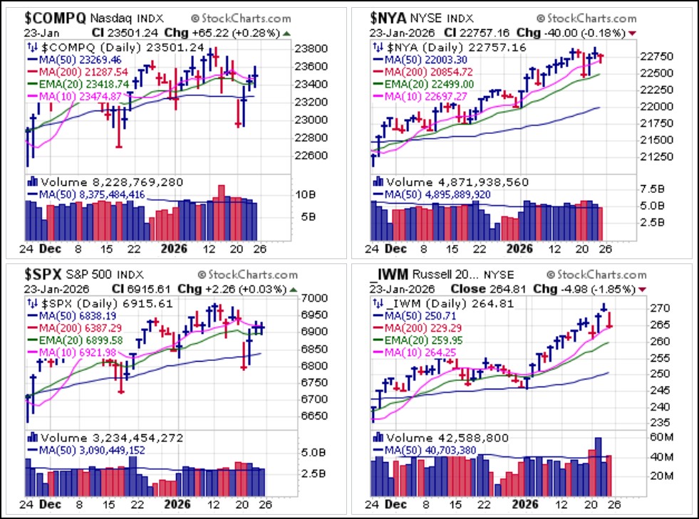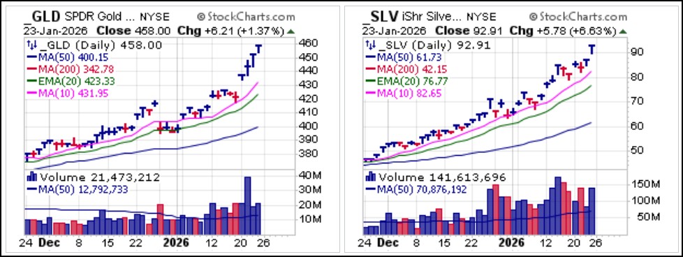 2026 is just getting started, and has so far has been an eventful year with the massive run in silver past the $100 level and three Orange Swans, Black Swan events created by the actions of the Orange Man himself, President Trump, hitting the market on the first three successive weekends in January. These were the U.S. military intervention in Venezuela, the serving of subpoenas on the Federal Reserve and finally threats of tariffs on European countries if the U.S. is not allowed to usurp Greenland. Amid all this we have been able to find strong profit opportunities in the right areas off the market in the New Year. This week big-stock earnings reports along with the first Fed policy announcement of 2026 on Wednesday will likely keep things lively.The Market Direction Model remains on a buy signal.