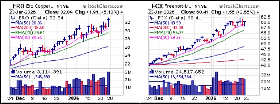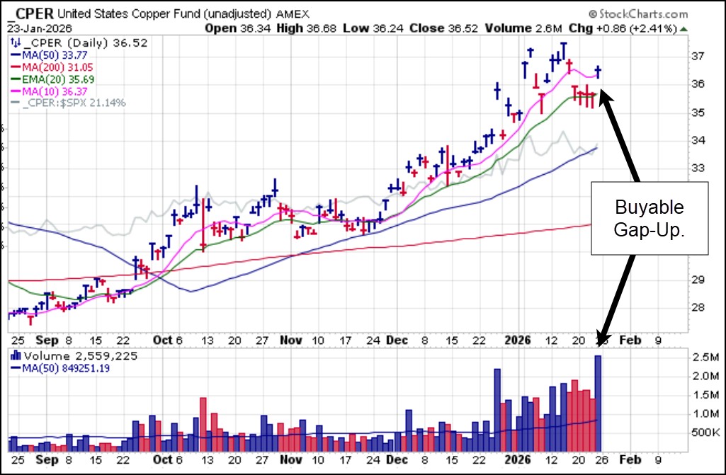 Copper, what Gil likes to refer to as the other precious metal, has also been trending higher with gold and silver. After a sharp pullback earlier in the week, the United States Copper Fund (CPER) found support along the 20-dema, otherwise known as heavy volume without further price support downward, as Bill O'Neil used to refer to it, before launching on a buyable gap-up (BGU) move on Friday. Copper previously cleared the $6.00 level for the first time the prior week and may be setting up for more new highs in 2026.
