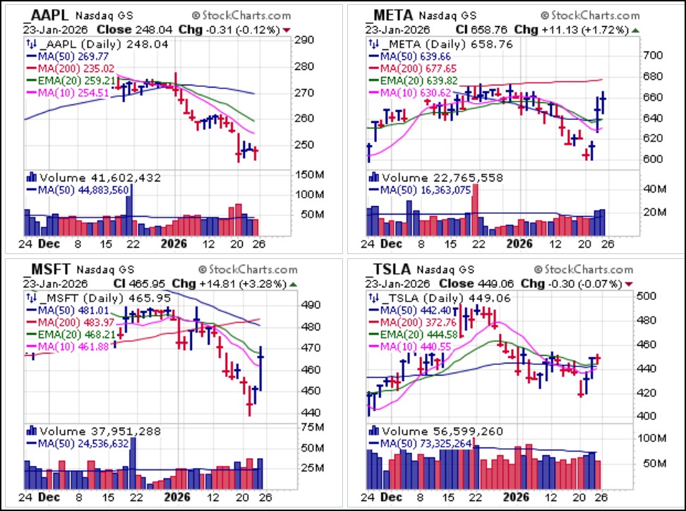 We are now moving into the heart of Q4 2025 earnings season in late January as we will see a number of big-stock semiconductor leaders and lagging big-stock NASDAQ names report this week. Among big-stock NASDAQ names Meta Platforms (META), Microsoft (MSFT) and Tesla (TSLA) all report on Wednesday after the close, while Apple (AAPL) reports Thursday after the close. These have the potential to affect the general market so should be monitored closely for their potential impact on market direction this week.