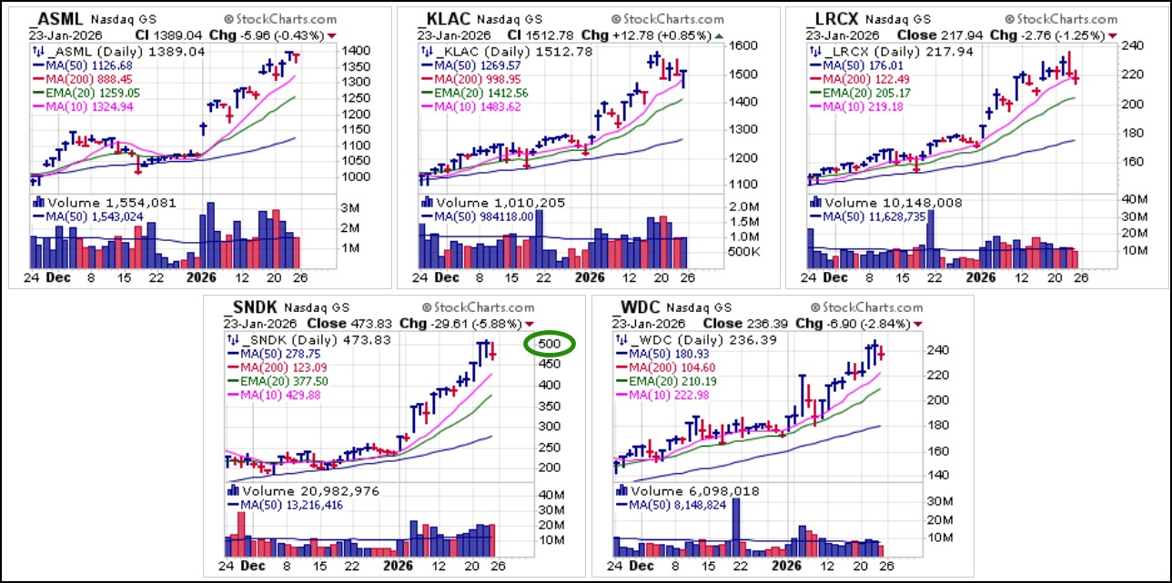Big-stock semiconductor leaders reporting this week include ASML Holdings (ASML) which is expected to report on Wednesday before the open while fellow semiconductor equipment makers Lam Research (LRCX) and KLAC Corp. (KLAC) report after the close on Wednesday and Thursday, respectively. Memory makers SanDisk (SNDK) and Western Digital Corp. (WDC) both report on Thursday after the close. Note that SNDK triggered a Century Mark short entry at the $500 level on Friday after rallying to an intraday high of 506.30 and then reversing to close at 473.83.Memory makers and semiconductor equipment names among the semis have been a strong area of tech leadership in the New Year, and earnings reports this week from this key group of stocks will certainly determine whether these strong trends can continue if they can pass the earnings test.