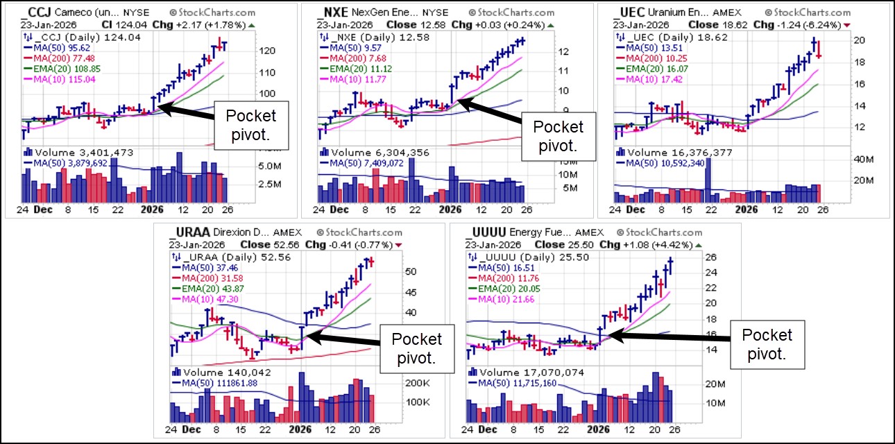 Furthering the argument that money has been rotating into commodity-related stocks is the action in uraniums. On January 2nd we issued Pocket Pivot Reports on five uranium names as they attempted to post bottom-fishing pocket pivots at various moving averages along recent lows. Of the six shown below, Cameco (CCJ), NexGen Energy (NXE), the Direxion Daily Uranium Bull 3X (URAA) ETF and Energy Fuels Corp. (UUUU) successfully traded high enough volume for valid pocket pivots on that day. Uranium Energy Corp. (UEC) did not, however, but that did not prevent it from moving higher with the group.
