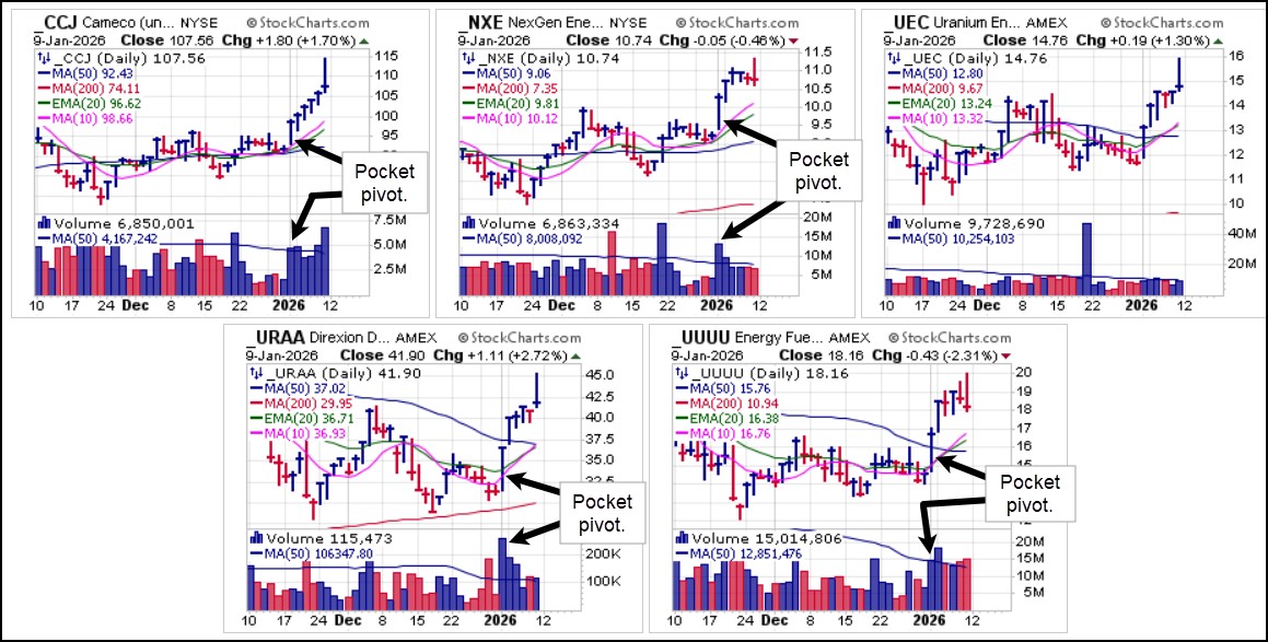 Two Fridays ago we also reported on pocket pivots in a variety of uranium names, including Cameco (CCJ), NexGen Energy (NXE), Uranium Energy Corp. (UEC), the Direxion Daily Uranium Bull 3X (URAA) ETF and Energy Fuels (UUUU). Only UEC failed to trade enough volume for a pocket pivot that day but since then all five have shot to higher highs. On Friday all five also reversed sharply to close near the lows of their daily price ranges, although this could be considered a normal reaction following sharp prior upside moves over the past six trading days.