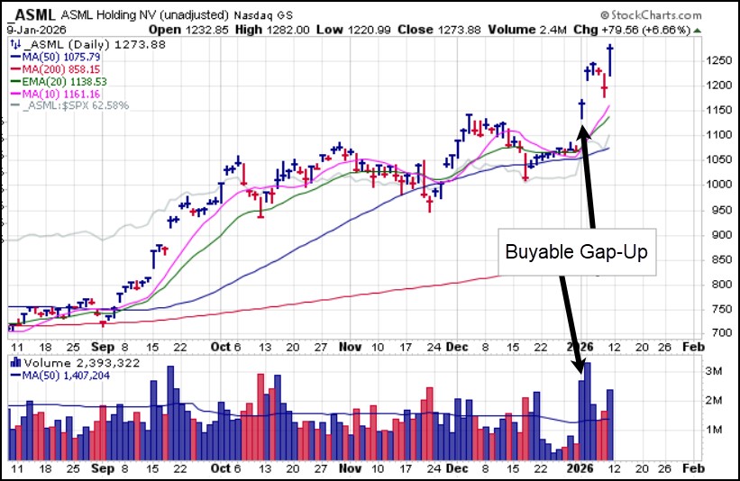 ASML Holdings (ASML) offers a prime example of strength in semiconductor equipment manufacturers. We reported on this last Friday when it posted a buyable gap-up (BGU) and the stock has continued to power higher, posting fresh all-time highs at the end of the week on big buying volume.