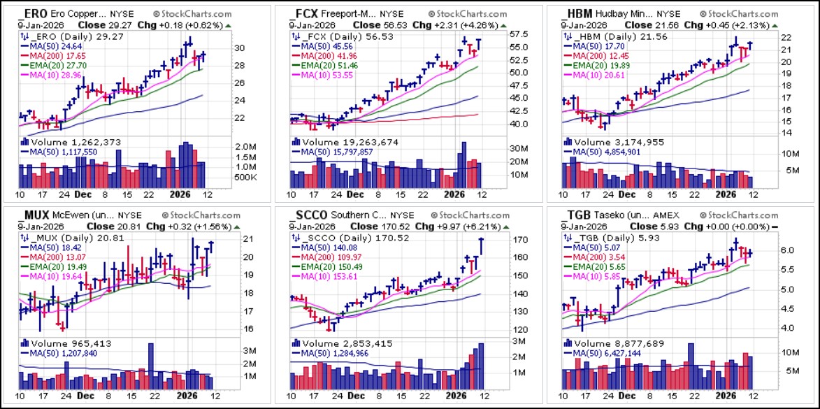 As part of the rally in commodity-related names helping to drive the NYSE Composite's outperformance, copper miners have continued to trend higher. Copper cleared the $6.00 level for the first time this past week before settling in to close the week at $5.84. Over the past several weeks we have followed various copper names as they have posted various long entry signals, including pocket pivots, U&Rs and VDUs on the way up. Most recently, on January 7th, we reported on an MAU&R in Ero Copper (ERO) and a buyable pullback in gold/copper hybrid McEwen, Inc. (MUX) following a prior pocket pivot. Among the stocks shown below, little Taseko Mines Ltd. (TGB) is in a buyable position along 10-dma support, and for the most part, all of these names remain buyable on pullbacks to 10-dma or 20-dema support as appropriate.