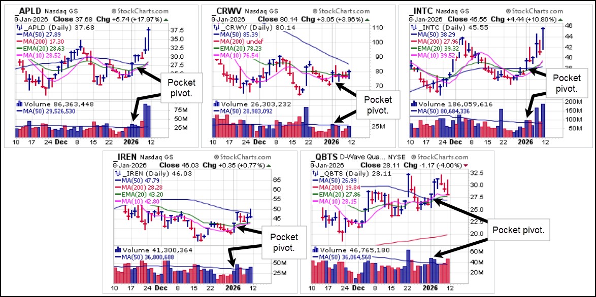 Other techs that we reported on two Fridays ago as pocket pivots have also been mixed, but among these, both Applied Digital (APLD) and Intel (INTC) have shot higher and broken out since. CoreWeave (CRWV) has tracked tight sideways since posting a pocket pivot two Fridays ago but may be setting up to move higher as it consolidates constructively. Iren Ltd. (IREN) has not made any further progress as it reversed along 50-dma resistance on Friday which could be interpreted as a short-sale entry using the 50-day as a covering guide. Keep in mind related company APLD reported blowout earnings pushing it toward new highs. Both transitioned to AI data center buildout so tend to correlate in price suggesting IREN could catch up. D-Wave Quantum (QBTS) moved higher after we reported its pocket pivot two Fridays ago but has since retraced back to the 10-dma and 20-dema on heavy selling volume.