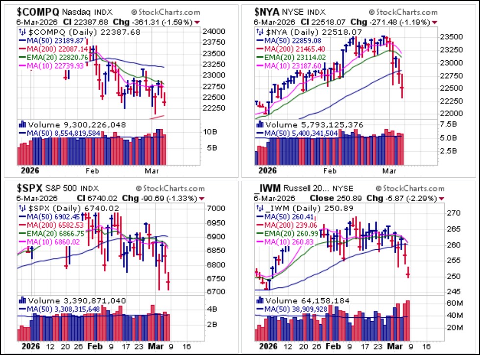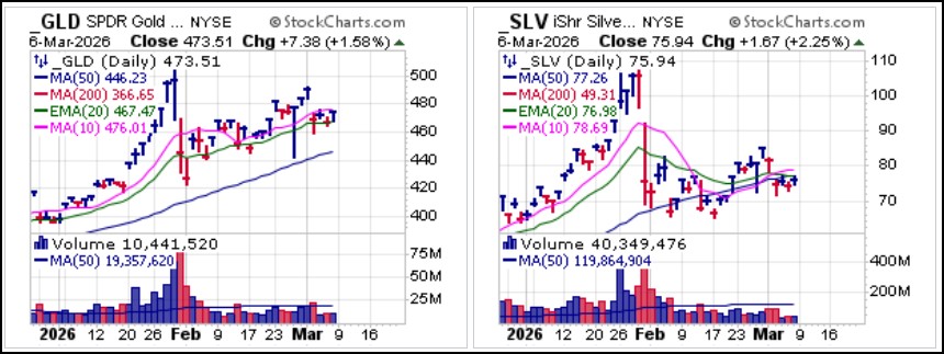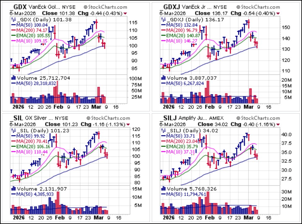 Mining stocks, which were leading the market into last week as many pushed to higher highs have most certainly succumbed to forced selling. Gold prices over $5,000 and silver prices over $80 an ounce will still result in major earnings increases for the miners, but forced selling will drag them lower. There is also the potential for the war in Iran to impact production costs along with higher overall inflation which has recently reared its head once again. The four primary mining ETFs, the VanEck Gold Miners (GDX), the VanEck Junior Gold Miners (GDXJ), the Global X Silver Miners (SIL) and the Amplify Junior Silver Miners (SILJ) ETFs all posted MAU&Rs at 50-dma support on Monday but it is not clear whether they will be able to hold in the face of more general market selling.