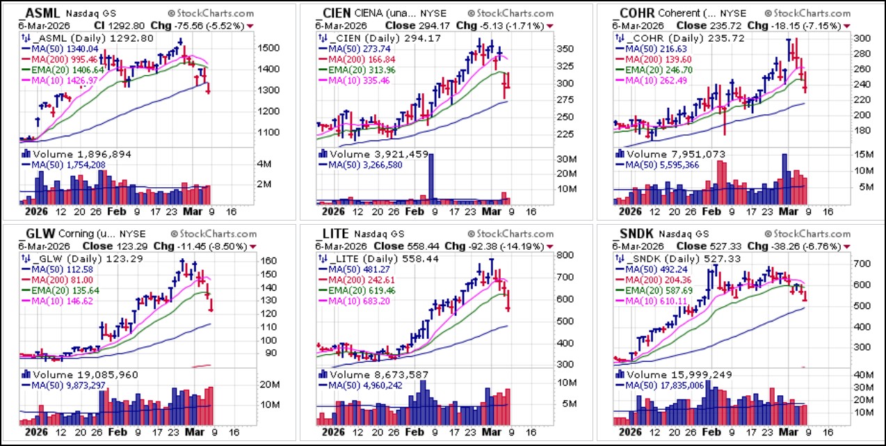 Most, if not all, of the last remaining AI leaders that were holding up well, including selected semiconductor equipment and memory makers and AI data center-related telecoms all came loose this past week after many posted new highs over the past 1-2 weeks.