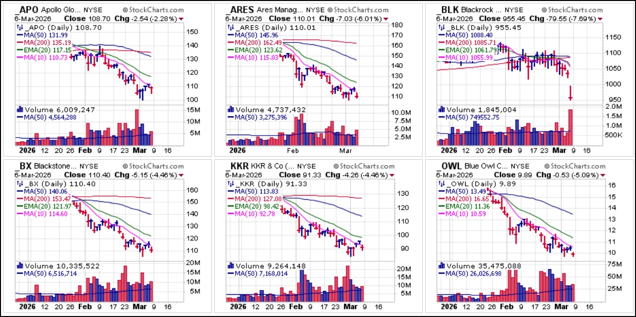 On Friday, big-stock asset manager Blackrock (BLK) gapped lower and declined over 7% after announcing that its flagship private credit firm, HPS Corporate Lending Fund, is now limiting investor withdrawals. This comes in the wake of other redemption bans from Blackstone Group (BX) and Blue Owl Capital (OWL). These three names and other related private credit issuers shown in the group chart below all topped in early January and have all steadily trended lower in what has been an ongoing private credit train wreck in progress.