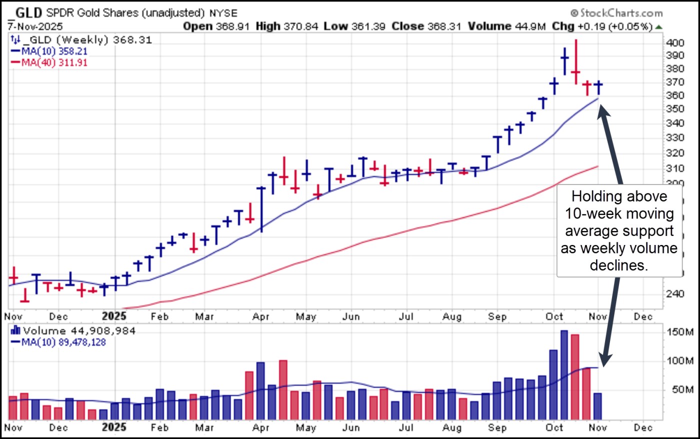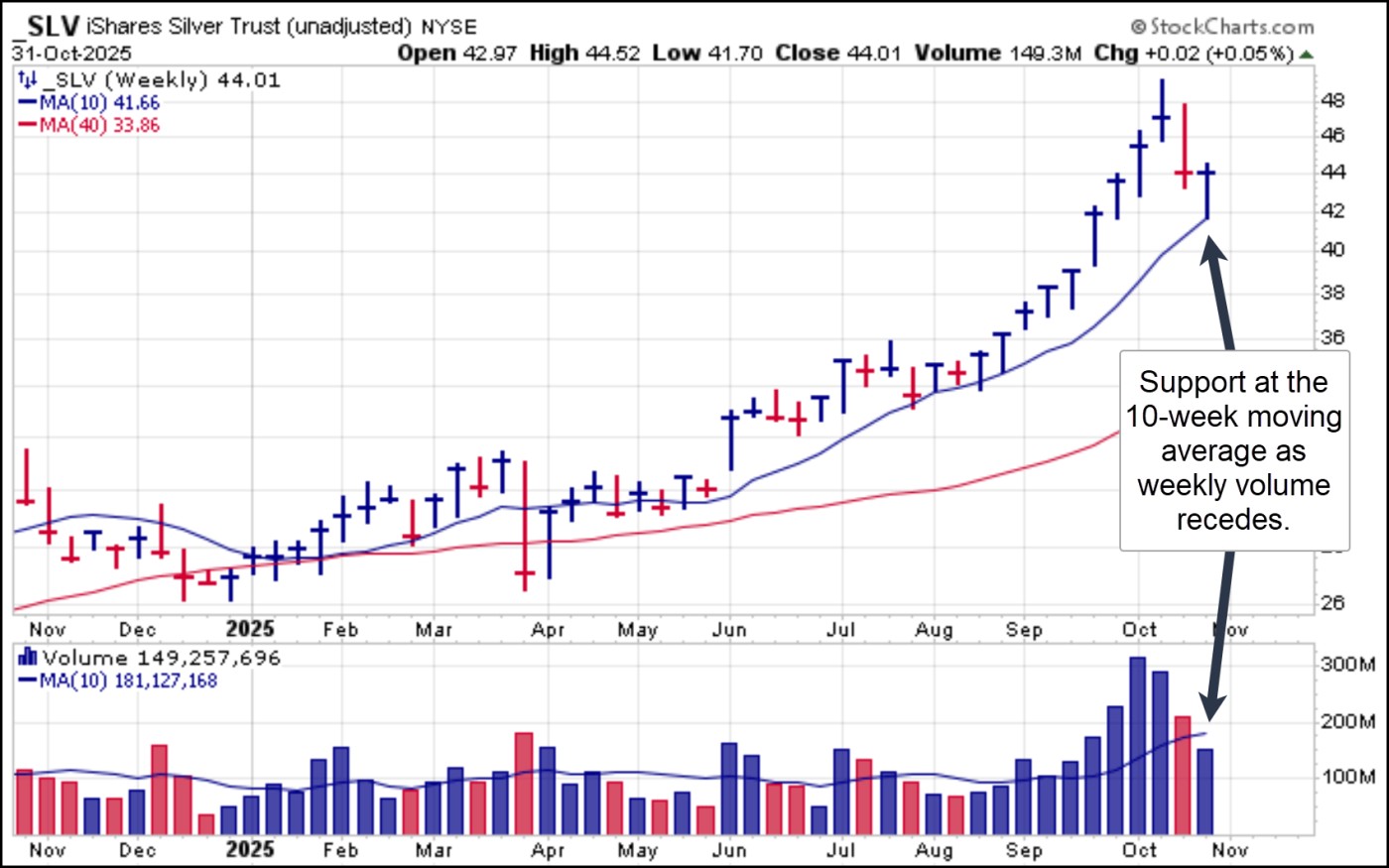 Gold and Silver remain in potential consolidation phases as their weekly charts show. Both the SPDR Gold Trust (GLD) and iShares Silver Trust (SLV) have pulled down near 10-week moving average support as weekly volume has dried up sharply.