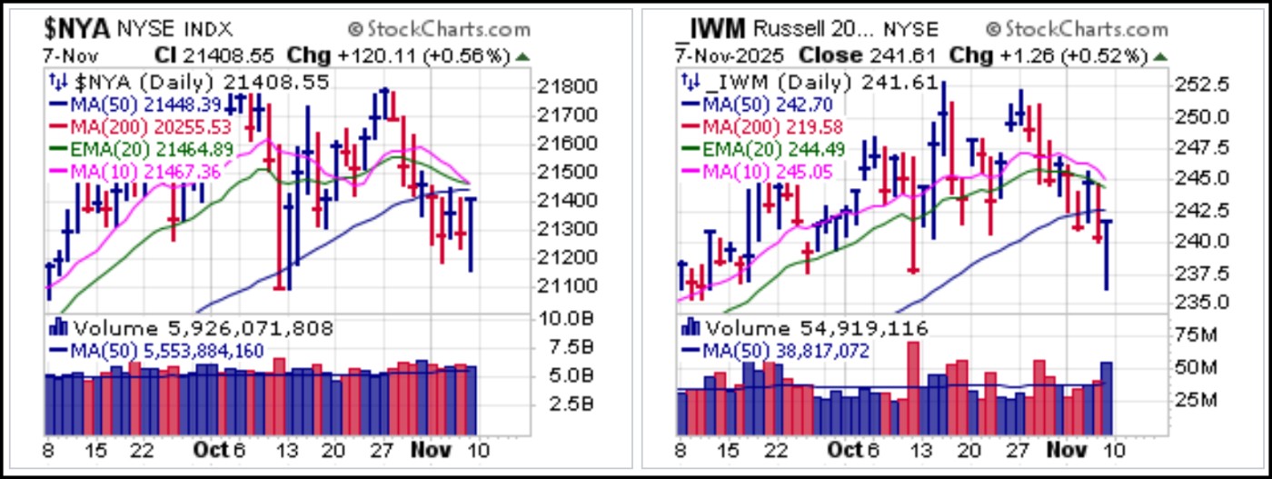 The broader non-tech centric indexes, the roughly 3,500 stock NYSE Composite and the 2,000 stock small-cap Russell 2000 illustrate the greater weakness seen in economically sensitive names as both indexes are now trading below their 50-day moving averages.