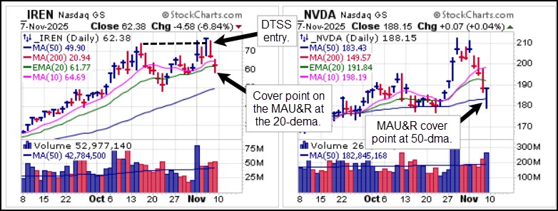 We issued Short-Sale Set-Up reports on Nvidia (NVDA) and IREN Ltd. (IREN) on Thursday morning as they were breaking near-term support levels. NVDA busted 20-dema support to trigger a short-sale entry Thursday morning, while IREN played out as a double-top short-sale (DTSS) entry as it reversed back below the 74.15 left-side peak of the cup base from which it tried to break out but failed earlier in the week. Both stocks immediately moved lower before NVDA posted an MAU&R cover point at the 50-dma and IREN a near-term MAU&R cover point at the 20-dema. These are potentially playable as long entries, possibly for swing-trades, as we see how far the market is able to rally following Friday's MAU&R at the 50-dma in the tech centric NASDAQ and S&P 500 Indexes.