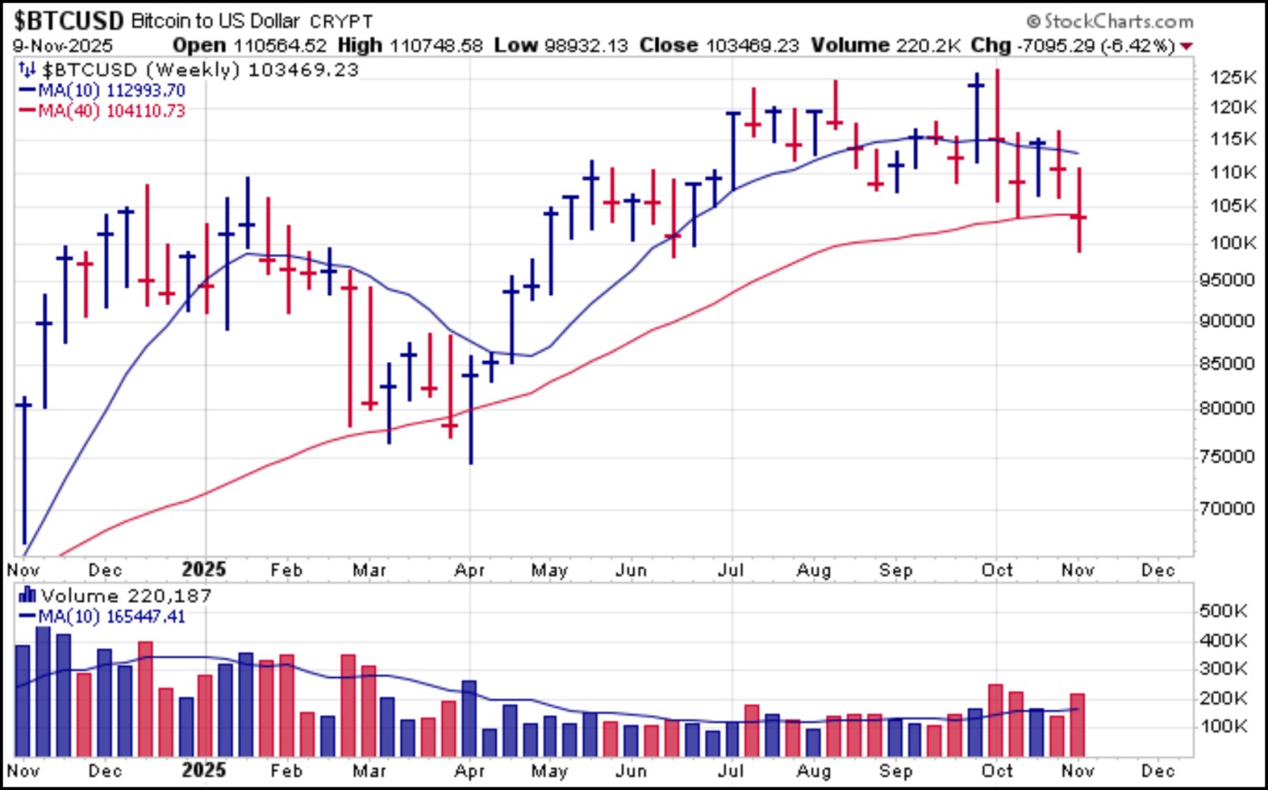 Bitcoin ($BTCUSD) on the weekly chart shows its first break and close below 40-week moving average support since late March. It has primarily played out as a short-sale target since failing on a breakout and triggering a double-top short-sale (DTSS) entry five weeks ago. $BTCUSD would need to regain the 40-week/200-day moving average before it would become viable on the long side. For now, downside risk remains in place.
