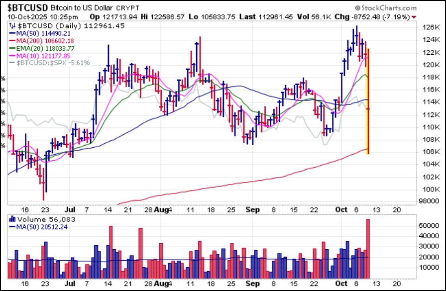 While precious metals traded higher on Friday as investors reached for lifeboats, Bitcoin ($BTCUSD) was trashed as sellers slammed it all the way back to major support at the 200-dma. $BTCUSD printed an intraday low of $105,833.75 before it bounced sharply to end the day at $112,774.45 on Friday at the time of this writing.
