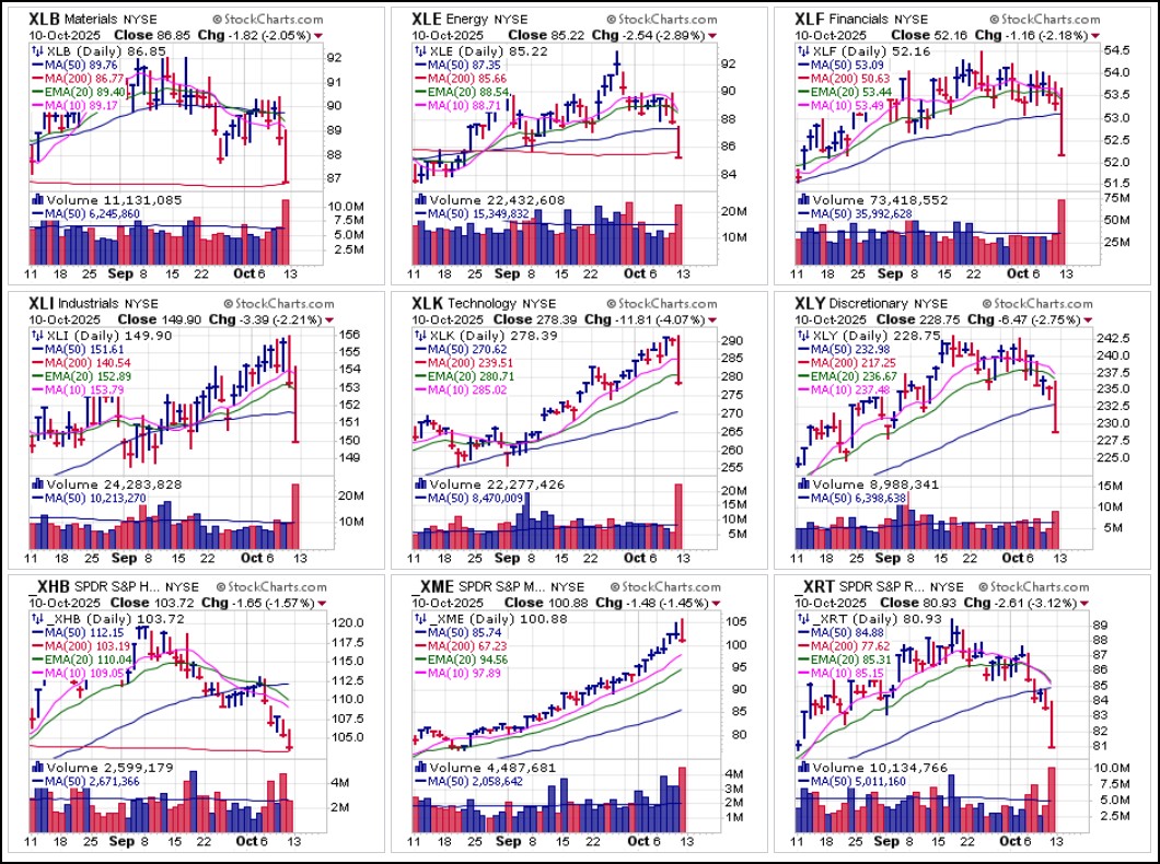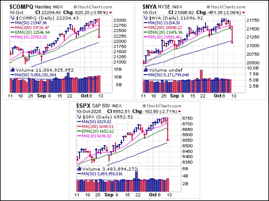This sent the market reeling to the downside, and it is likely that stretched valuations among AI techs and other speculative areas of the market where we have seen extremely high PE-expansions were in need of a bit of a snapback. And snap back they did as the NYSE Composite Index busted 50-dma support and both the NASDAQ and S&P 500 appear set to test 50-dma support on Monday. After the close on Friday, Trump confirmed that 100% tariffs on China would go into effect on November 1st, which we assume gives him plenty of time to "chicken out" under the right circumstances. China may also acquiesce on some points. Remember that stock and Bitcoin/crypto markets dumped in April after Trump set the tariff rate on China to as high as 145% in mid-April which turned out to be a major low for markets. A truce reduced most tariffs and markets continued to bounce sharply.