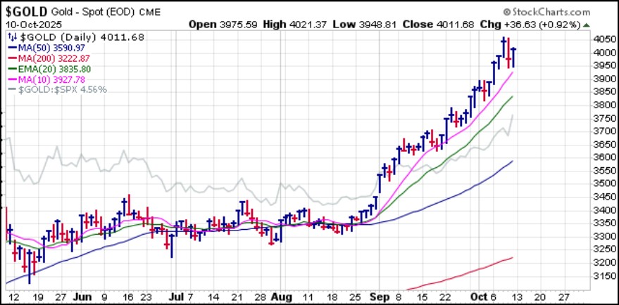Spot Gold ended the week at $4,011.68 an ounce, its first week above $4,000 in history. On Friday Spot Gold pulled down near 10-dma support which it has obeyed all the way up since breaking out in early September. COMEX Gold Futures ended the week at $4,035.50 an ounce.