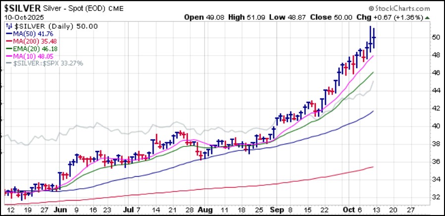 Spot Silver also posted new 14-year highs this week, posting a new closing high on Friday as it closed precisely at $50.00 an ounce. COMEX Silver Futures are trading down at $47.40 an ounce as physical supply in London is lacking. The London Bullion Market (LBMA), a key hub for physical silver trading and spot price discovery, has been grappling with acute shortages of immediately available physical silver metal. Demand from industrial users and investors has outstripped supply, pushing spot prices up independently of U.S. COMEX Futures. Silver continues to hold above 10-dma support as it has since breaking out in late August.