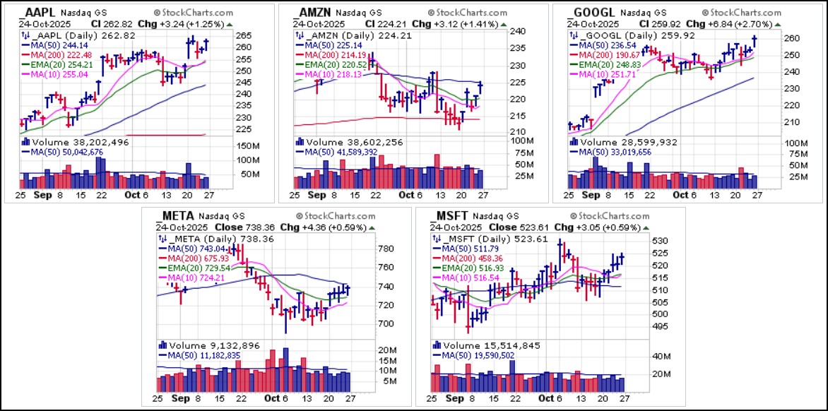 Earnings season is heating up as several big-stock NASDAQ names and index influencers are set to report this week. On Wednesday, Alphabet (GOOGL), Meta Platforms (META), and Microsoft (MSFT) are expected to report after the close, with Apple (AAPL) and Amazon.com (AMZN) expected on Thursday after the close. AMZN and META have been living below their 50-dmas for several weeks now and on Friday rallied up to 50-dma resistance. AAPL and GOOGL are both in breakout positions while MSFT is splitting the difference as it has recently recovered back above the 50-dma but remains well off its recent all-time highs. How these earnings reports play out, on balance, could have a marked effect on the general market action, so will be worth watching closely this week.
