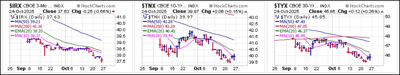 Core CPI printed 0.2% vs. expectations of 0.3% and Headline CPI 0.3% vs. expectations of 0.4%. Annual inflation remains at around 3% as the government measures it, which likely indicates that real inflation is somewhere at 5-6%. Nevertheless, 3% is well above the Fed's alleged long-term inflation target of 2%, but is not likely to keep the Fed from lowering rates again when they meet this week. The market has already taken the liberty of bringing rates down well ahead of the Fed, with the 3-Month ($TYX), 10-Year ($TNX), and 30-Year ($TYX) Treasury Yields trending to lower lows this past week.