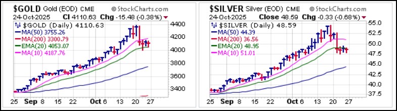 It was an historic week for gold as Spot Gold printed an all-time high of $4,381.51 on Monday before selling off over 5% on Tuesday. Many felt that the $4,000 level would present logical round number resistance for the yellow metal, but it simply streaked through $4,000 last week before finally correcting this week. And while many are trying to call the top in gold, for now the $4,000 level and the 20-dema have held as near-term support.Meanwhile, Spot Silver, after reaching a new all-time high of $54.49 an ounce two Fridays ago, corrected sharply and is now sitting in a short bear flag just below the 20-dema.