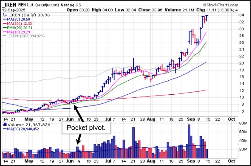 IREN Ltd. (IREN), a crypto miner that is pivoting its business towards low-cost Data Center infrastructure solutions. We originally reported on IREN as a pocket pivot along the $10 level back in early June and the stock has move than tripled since then. More recently, as the stock was hanging around in the $20 price area, we note that the 18-times forward PE made IREN less vulnerable to correction as a result of an extreme PE-expansion, and so far that has held true.