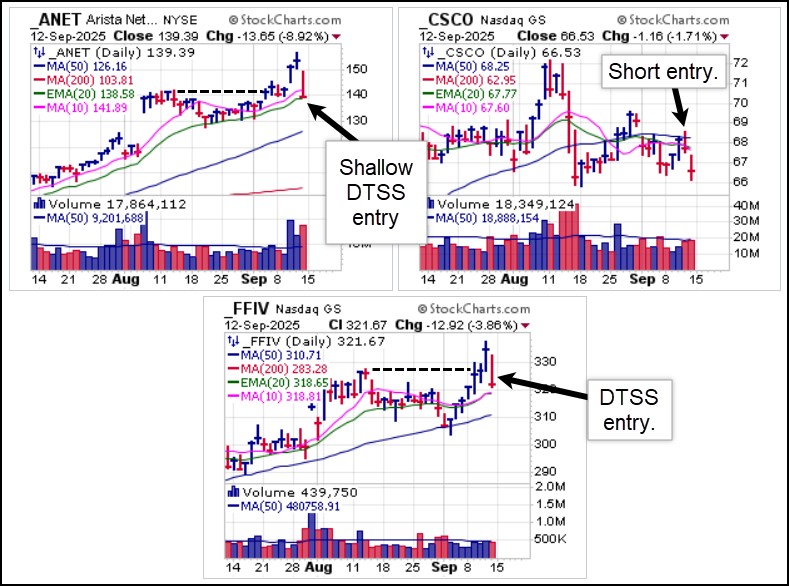 Many AI-related tech names also rallied on the ORCL earnings news, with some starting to falter on Friday, such as Arista Networks (ANET) and F5 Networks (FFIV), both of which triggered double-top short-sale (DTSS) entries as they failed on recent breakouts and dropped below the left-side peaks of cup formations.