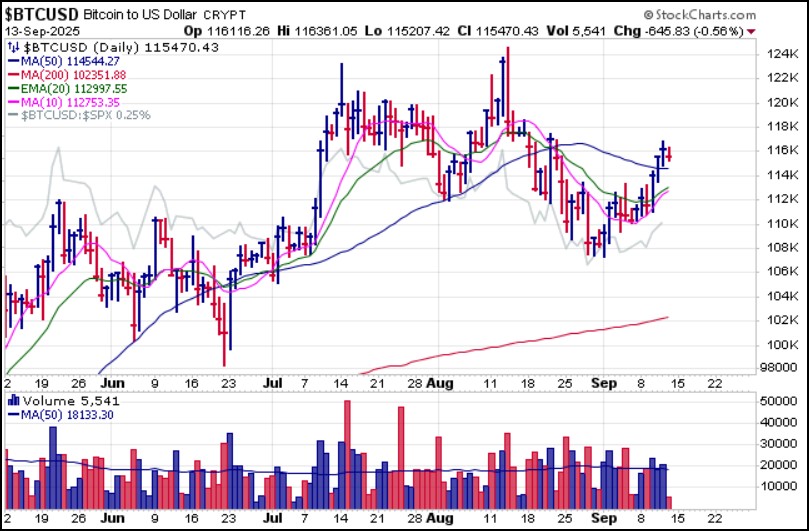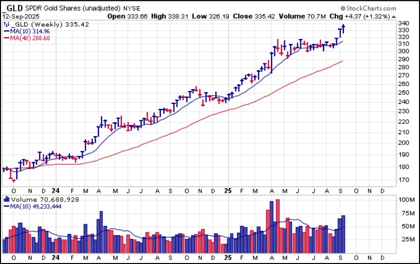 SPDR Gold Trust (GLD) ended the week at $3,680.70 an ounce after reaching an all-time intraday high of $3,715.20 an ounce, clearing the $3,700 level for the first time in history. We discussed the tight action in gold back in mid-September in this report, noting that it appeared to be coiling for a breakout, and it has not disappointed as it continue to post new highs.