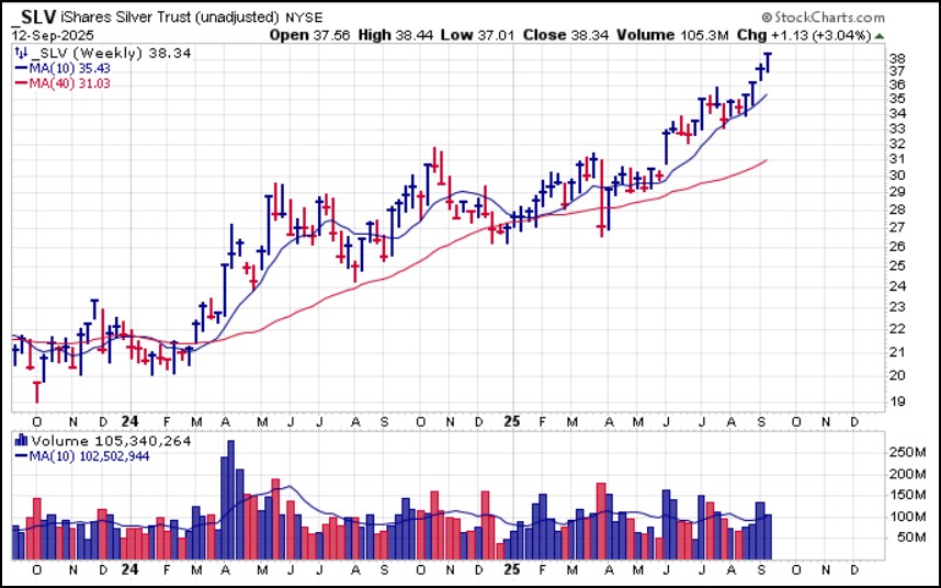 iShares Silver Trust (SLV) closed a dime below Friday's intraday high as it posted its second week of upside after breaking out from a short five-week flag formation in late August.
