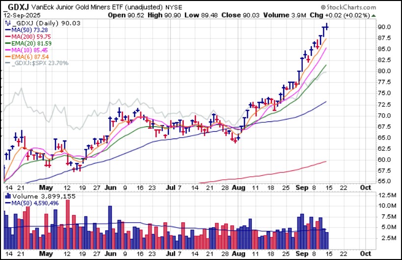 VanEck Junior Gold Miners (GDXJ) ETF expresses the extreme outperformance of the group as it trends sharply higher and along the steeply rising 6-day exponential moving average.
