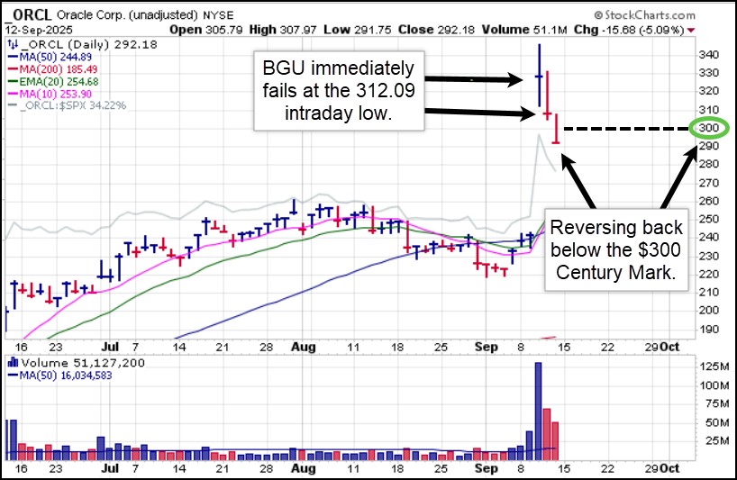 Oracle (ORCL) failed to hold its BGU low at 312.09, failing the next day after posting a BGU following earnings on Tuesday afternoon. The BGU failed the very next day, on Thursday, as the stock broke below the 312.09 intraday low of Wednesday's BGU price range. ORCL then went on to trigger a Jesse Livermore Century Mark Short-Sale entry as it reversed back below the $300 price level. ORCL underscores the difficulty in finding fresh set-ups that work in this market. As we noted last week, often it can seem as if identifying actionable set-ups that work has become very much like throwing mud at the wall and hoping something sticks.