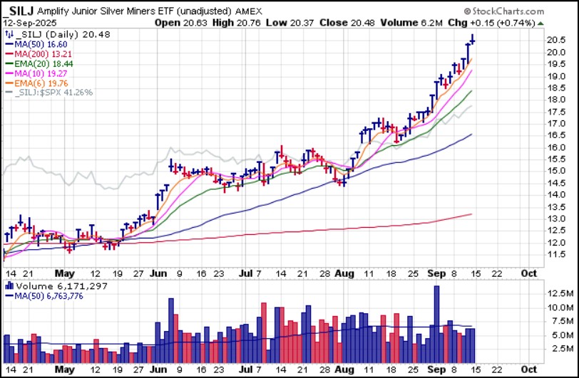 Amplify Junior Silver Miners (SILJ) ETF, like the GDXJ, continues to trend along the steeply rising 6-day exponential moving average (6-dema). At some point, the group will correct and consolidate these tremendous price gains as they potentially begin building new bases at higher levels, but for now the sharp trends in gold and silver miners remain in force.