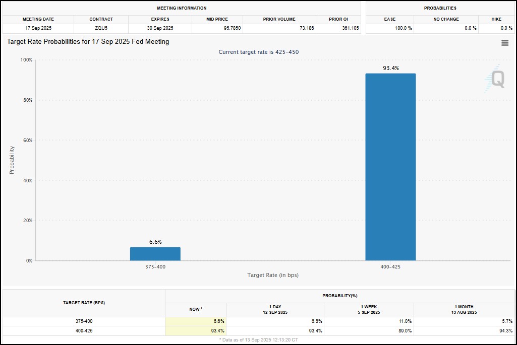 The latest Fed policy announcement will be out on Wednesday, and currently Fed Funds Futures traders are pricing in a 93.4% probability of a 1/4% rate cut and a 6.6% probability of a 1/2% rate cut. Market analysts and punditry have cited recently weak employment data as they argue for a 1/2% rate cut on Wednesday. Whatever the Fed does, expect plenty of volatility in either direction whether they cut 1/4% or 1/2%. This has changed from Friday when these odds showed a 3% higher 96.4% chance of a 1/4% rate cut and 3% lower 3.6% chance of a 1/2% rate cut.