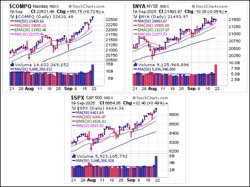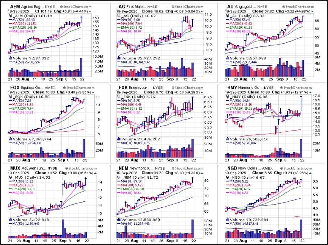 The tech-centric NASDAQ Composite and S&P 500 Indexes again ground their way to new highs Friday on the largest September options expiration in history where $5.3 trillion in notional options value expired. Breadth was negative, however, as the big price moves on Friday were mostly centered in hot, FOMO-related areas like small modular nuclear reactors and quantum computing along with the precious metals space. Precious metals and the precious miners are being driven by fundamentals as gold and silver prices continue to forge all-time and 14-year highs, respectively.