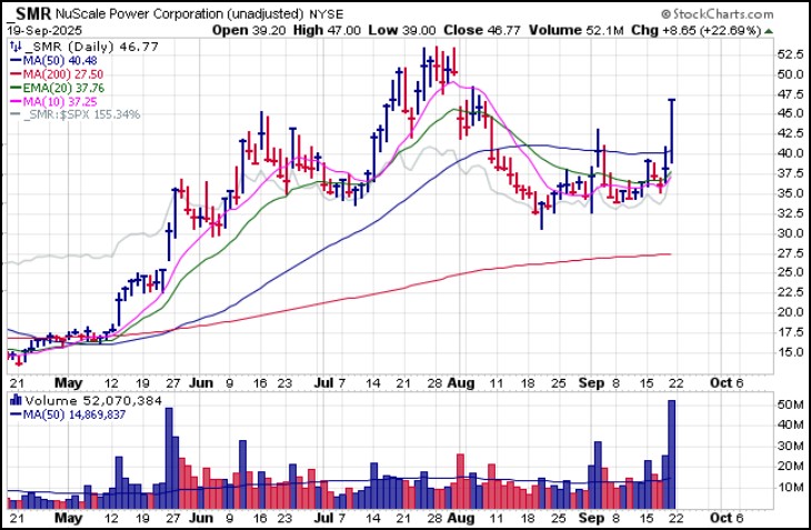While the precious metals sector was on fire Friday, so were some of the more speculative areas of the market, including nuclear power names operating in the small modular reactor space. Forty-two minutes after the opening bell on Friday we issued a Pocket Pivot Review report on small modular reactor maker NuScale Power (SMR) as it just cleared the 50-dma. From there the stock shot nearly 15% higher to close at 46.77.