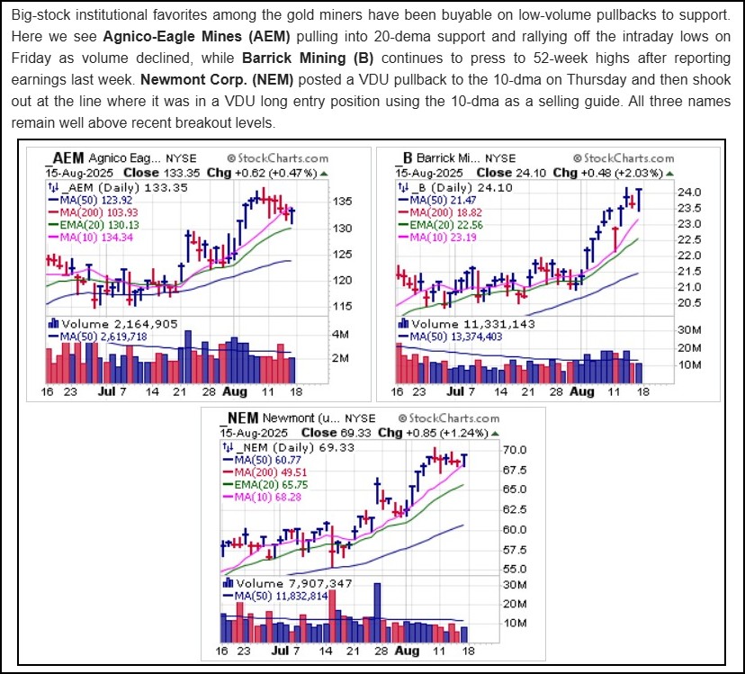 We have certainly not been oblivious to the quiet performance of the precious metals miners in 2025. Some comments on the big-stock institutional favorites below in a screenshot from our August 17th Weekend Review report.