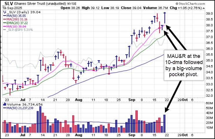 Silver also finished the week at 14-year highs as the iShares Silver Trust (SLV) followed up on a moving average undercut & rally (MAU&R) at the 10-dma on Thursday by posting a big-volume pocket pivot to a new 14-year closing high on Friday.