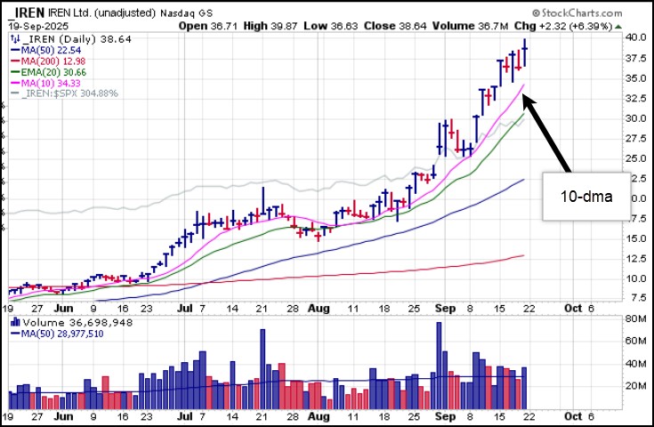 We have been following crypto miner turned AI Data Center infrastructure provider IREN Ltd. (IREN) since May, and more recently discussed pocket pivots it was posting along the 10-dma and 20-dema in mid-August, prior to the stock doubling in about four weeks' time. The stock is now quite extended and is just shy of obeying the 10-dma for seven weeks. We would assume that it will continue to do so long enough to invoke the Seven-Week Rule using the 10-day line as a selling guide once it completes its seventh week of following the 10-dma without a technical moving average violation.