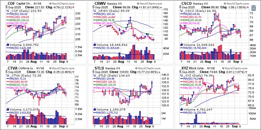 On Tuesday and Wednesday we sent out a number of Short-Sale Set-Up reports, and these can be reviewed in hindsight in the group charts shown below. To some extent, this is almost tantamount to throwing mud at the wall and seeing what sticks. Sometimes, the set-up does not play out cleanly - there is often some chopping around before resolving one way or the other.