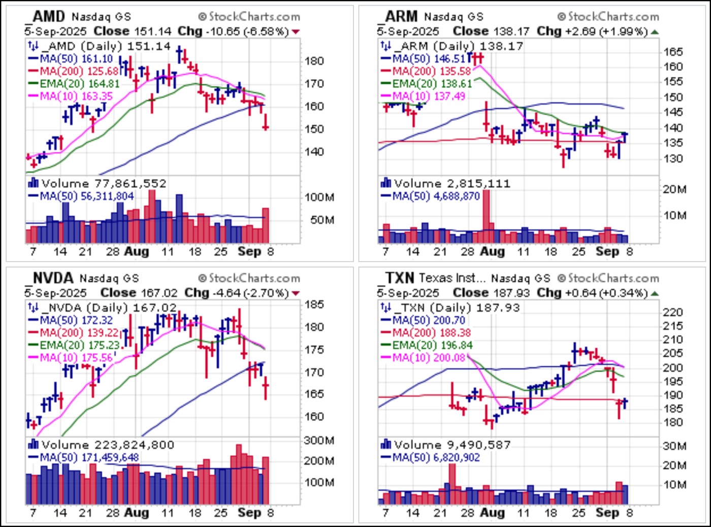 Texas Instruments (TXN) illustrate various states of disrepair as they trend lower or lurk in the lower reaches of their charts.