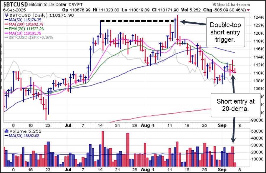 Bitcoin ($BTCUSD) remains in a downtrend after double-topping and posting a textbook double-top short-sale (DTSS) entry trigger back on August 14th. On Friday $BTCUSD reversed at 20-dema resistance where another short-sale entry was possible. As of mid-day Saturday it is starting to drift back below the 10-dma as well. It is interesting to note that having Trump as the self-declared