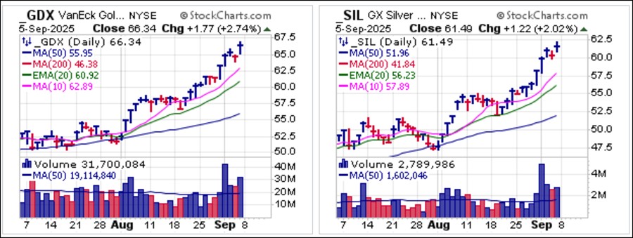 Global X Silver Miners (SIL) ETFs show below. These are now quite extended from their 10-day moving averages.