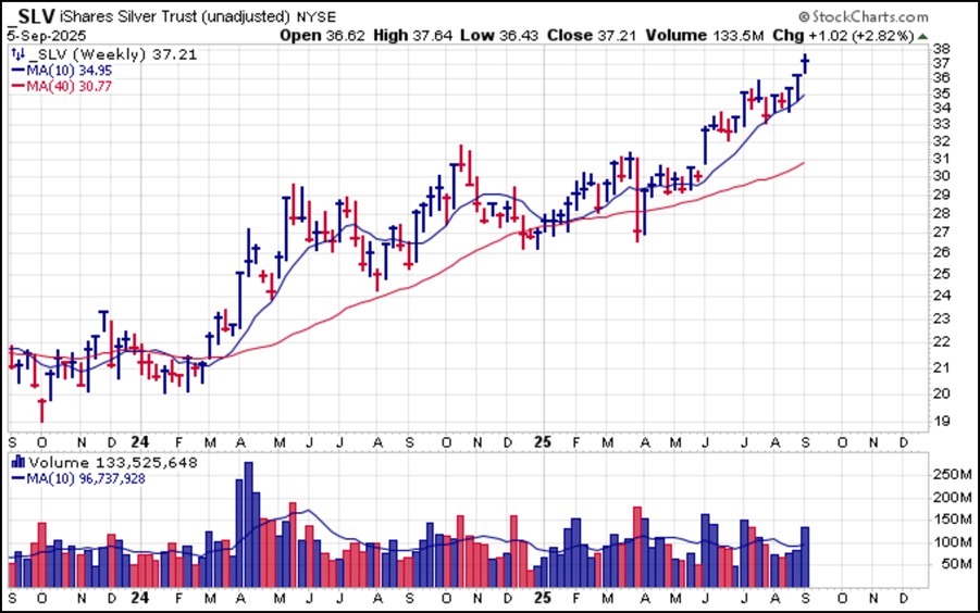 Silver also followed through on last week's breakout from a short five-week base by posting a nearly 14-year high as Spot Silver hit a peak of 41.47 before settling in to end the week at 40.92. With the $40.00 an ounce level now in the rear view mirror, the $50 peak seen back in 2011 edges ever closer.