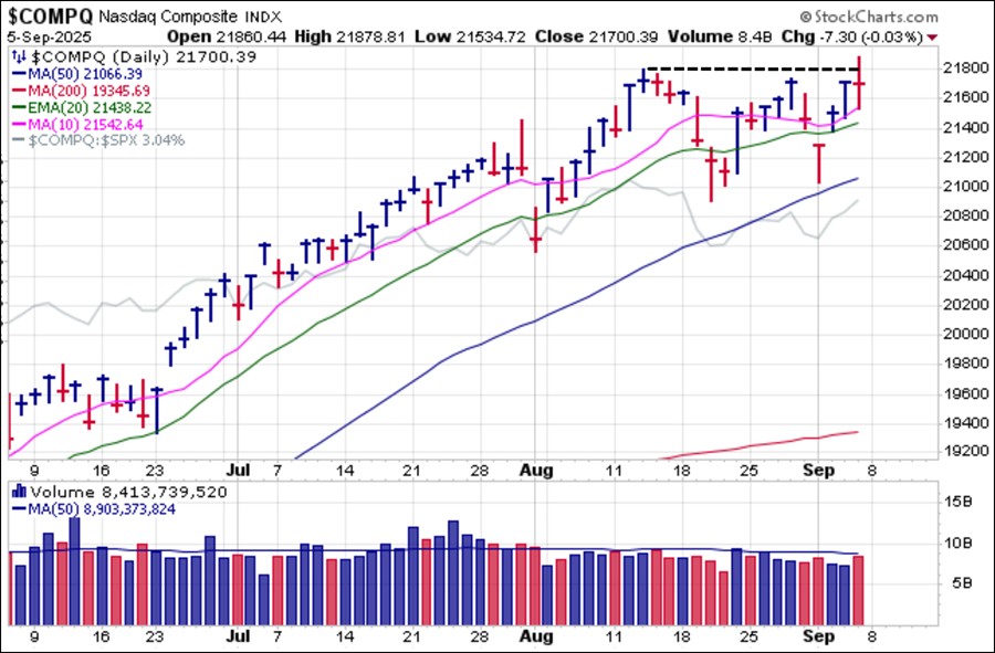 Eventually, that seeped into the market's consciousness and the indexes soon reversed to close down on the day across the board. This resulted, at least for the moment, in double-top type action in all four of those indexes as represented by the daily chart of the NASDAQ Composite, below. For now, the indexes are clinging to 10-dma support as the underlying situation with respect to individual stocks remains mixed.