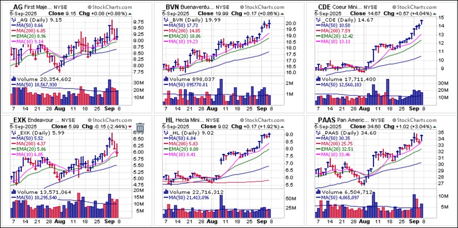 Silver miners are mostly trending higher, but there are two notable exceptions among the six shown below.